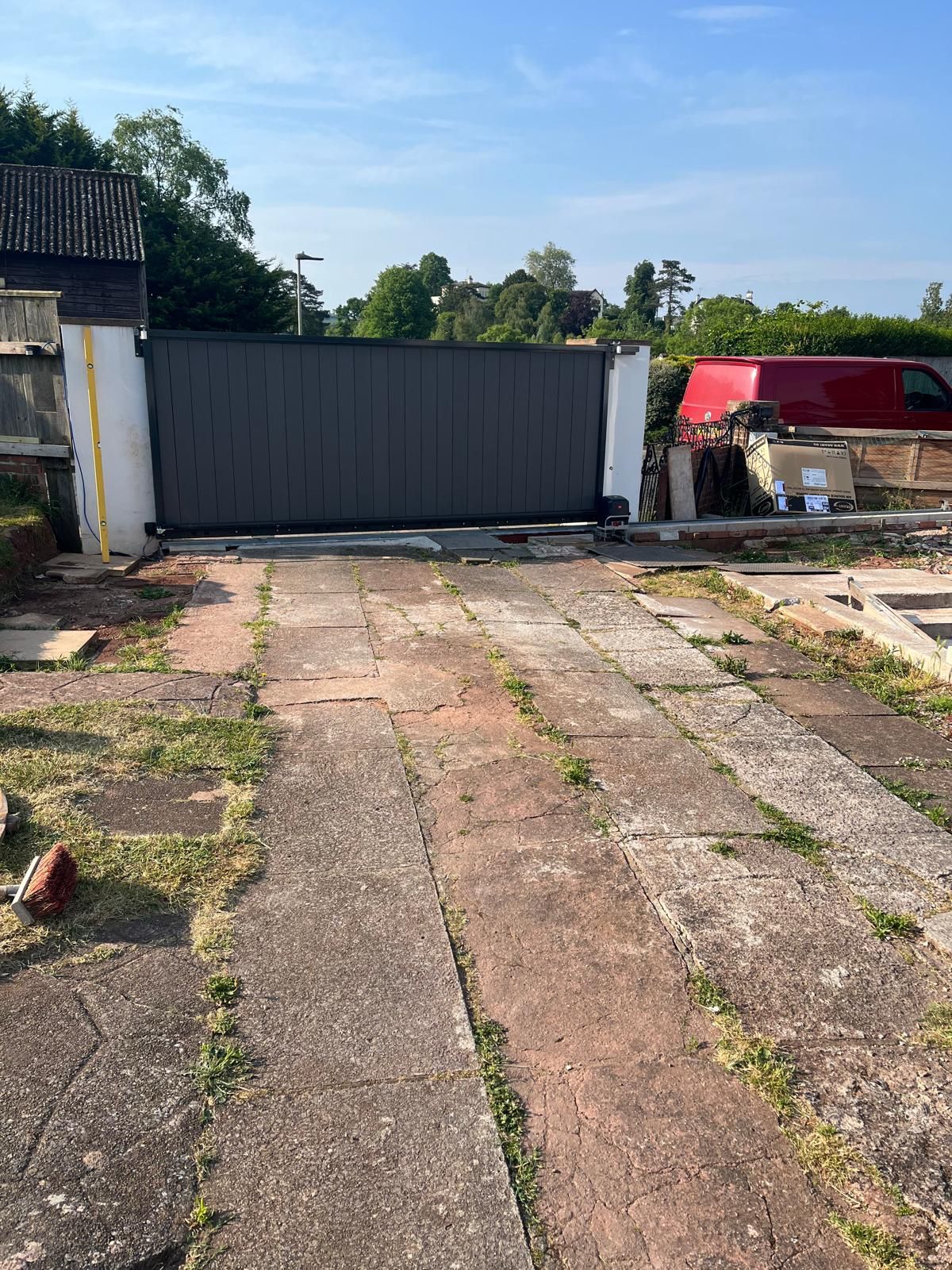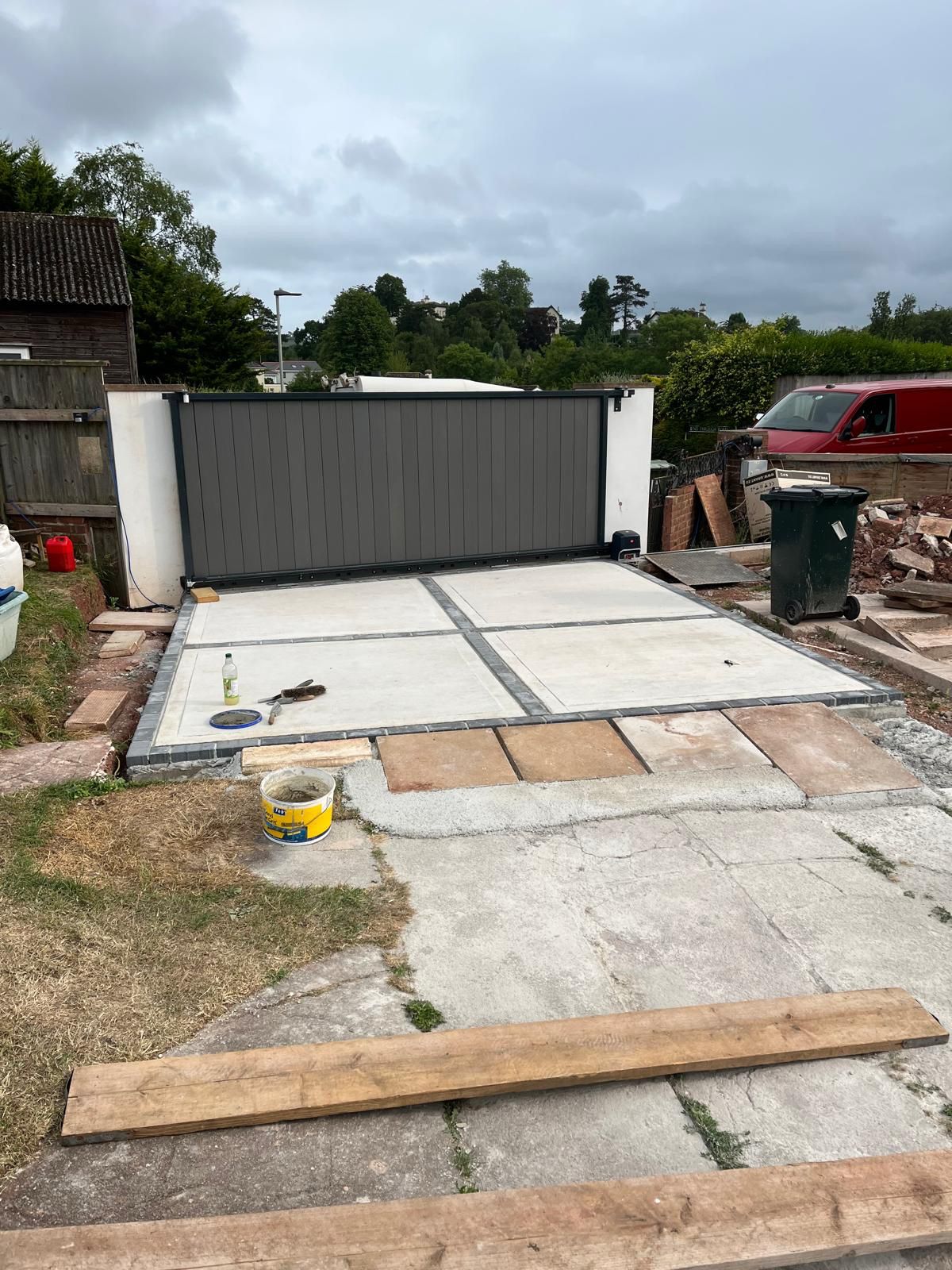 A new concrete driveway laid to compliment a new entrance gate. The concrete area had borders in block paving to break the expansion of concrete, also allowing expansion to prevent cracking in the concrete bays.